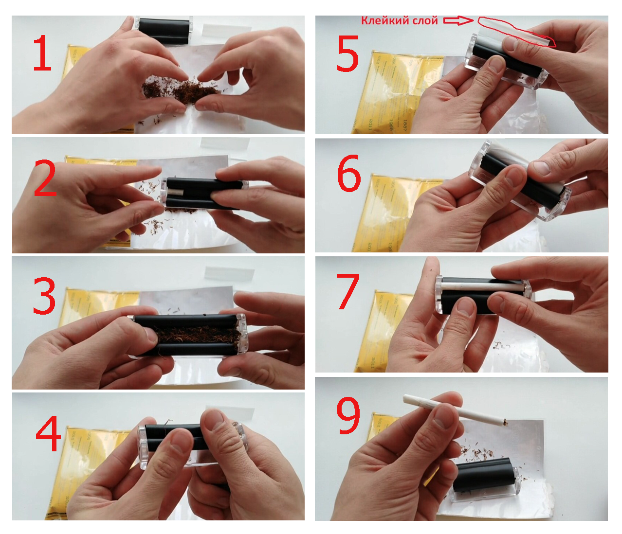 Как делать самокрутки с помощью классической машинки для самокруток?1. Подготовить табак: его нужно немного распушить, чтобы придать ему объем. Иначе тяга у самокрутки будет очень тяжелой. 2. Открыть машинку для самокруток и вложить фильтр в самый край машинки (не важно: правый или левый). 3. В оставшееся место вложить табак. Немного его утрамбовать (чем влажнее табак, тем меньше его стоит утрамбовывать, иначе не будет тяги). 4. Закрыть машинку для самокруток и провернуть ближний к вам валик машинки на себя. (ВАЖНО! Машинка всегда должна "смотреть" подвижным валиком на Вас!)