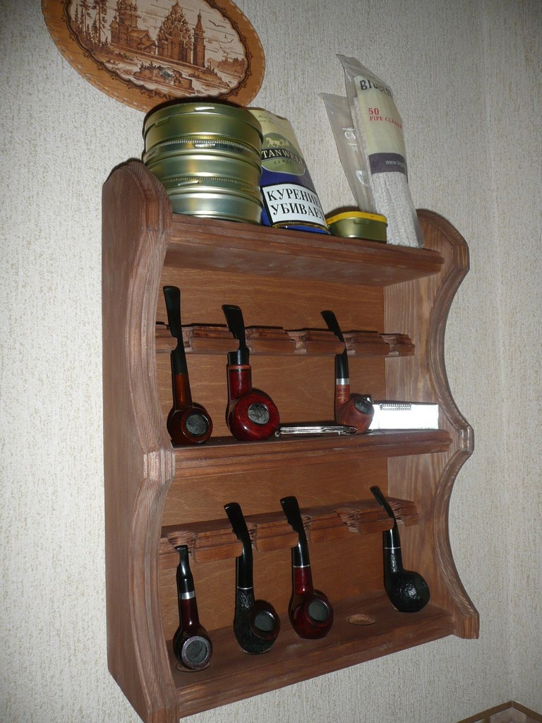 Трубочные полки и шкафы – Михаил ВетерТрубокурам от трубокура![]() Приветствую всех заглянувших в читальный зал! Ежедневно нас окружают разные вещи, но как редко мы задумываемся о том, как их делают и почему именно так, а не иначе… Хочу рассказать о том, как устроены мои трубочные шкафы и полки. Почему именно такой формы посадочные места и держатели для мундштуков. Какие соединения и клей, какие материалы использую и чем покрываю готовые изделия. К сожалению, пока не найти времени, чтобы расширить представленную линейку в магазине СуперТабак и выставить там шкафы, но буду стараться исправить это. Первые шагиК своей первой трубке я пришел в 2011 году и в 2014 решил, что мне пора полочку для трубок завести. В продаже ничего такого не нашел, были настольные подставки и шкафы… Шкаф для своих нескольких дешевых трубок я счел слишком роскошным жилищем, а настольные ставить негде. Дальше, как обычно это бывает у многих, – что, у меня рук нет? Сам сделаю, легко! Привез с дачи доски, купил ручной фрезер и приступил к осуществлению своей идеи! Надо сказать, что опыта с мебелью у меня практически не было и, конечно, не обошлось без ошибок, но в целом получилась вполне рабочая полочка. Если кто из читателей решит также как я сделать своими руками, не имея опыта особого, то рекомендовал бы: