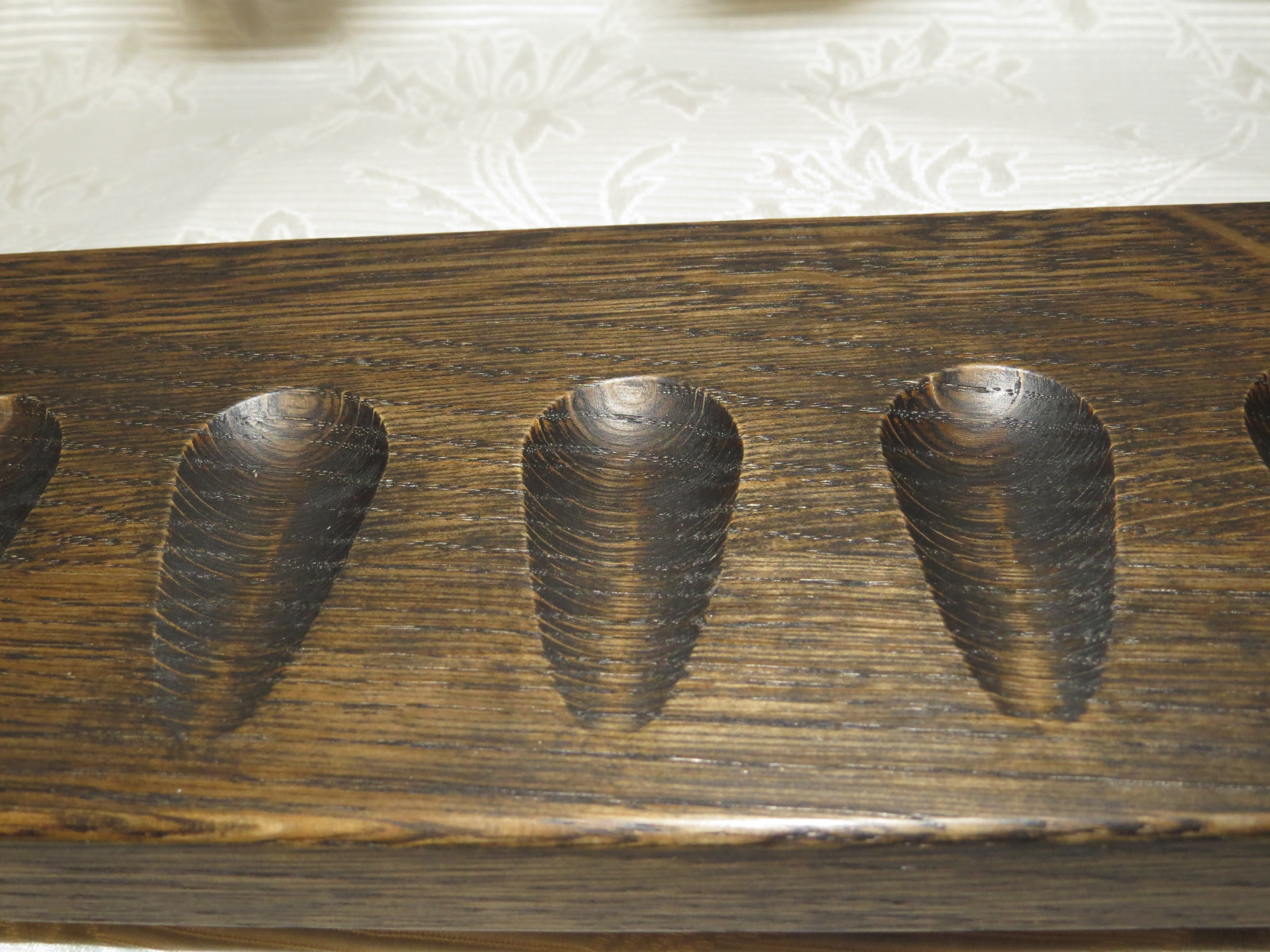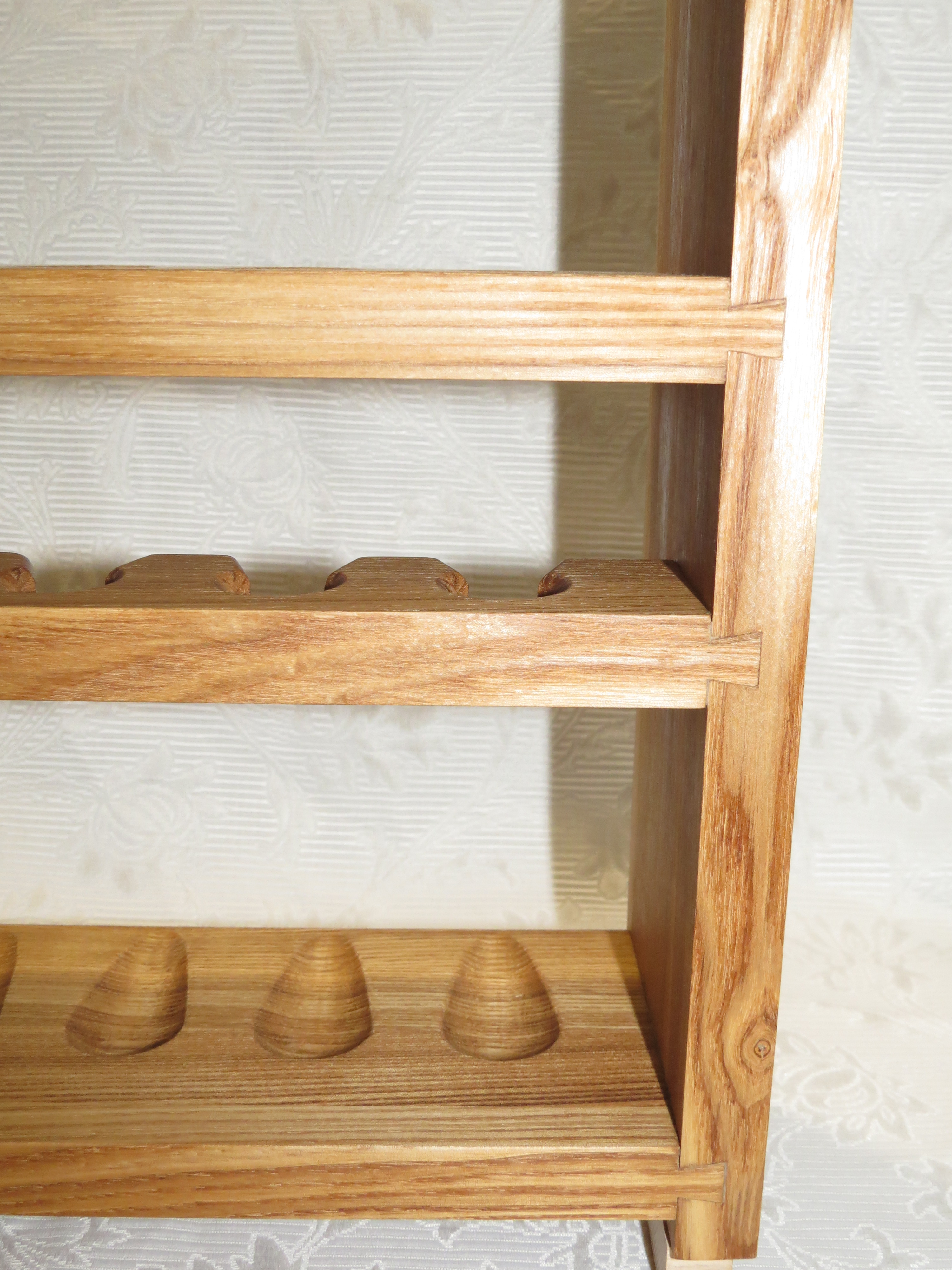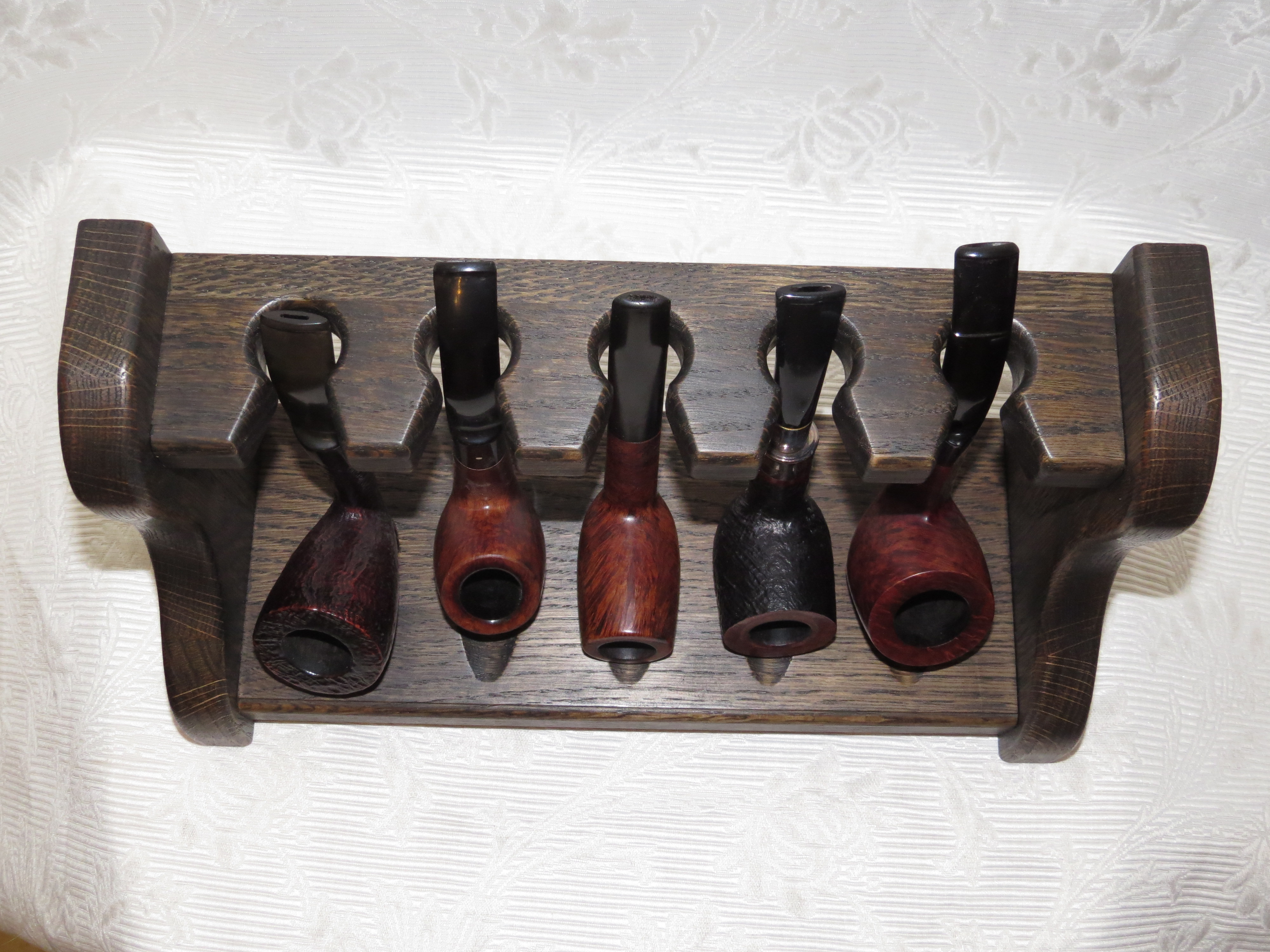 ![]() Как только разместил в ней трубки, сел изучать матчасть по столярному делу! Полка хоть и рабочая вышла, но я хотел уже другого… В течении нескольких лет, как только находил свободное от работы и семьи время, я пробовал и пробовал делать новые полки. Хотелось найти идеальные (в моем понимании) формы посадочных мест и держателей, а также экспериментировал с материалами и финишной обработкой поверхностей. Конечно, за это время прикупил разного инструмента и оборудовал мастерскую (фото 16-го года). ![]() Лишь в 2019 году, когда появилось больше времени, стало что-то получаться. В 2020 году я решил, что мои работы уже можно показывать, предлагать и дело сдвинулось! Первый шкаф был представлен коллегам-трубокурам. ![]() Я и сегодня в постоянном поиске нового и совершенствовании старого, думаю, этот процесс остановить будет трудно. Посадочные местаБольшой победой для меня стало, что были найдены нужные формы посадочных мест и расположение держателя мундштука относительно посадочного места для чаши. Также окончательно определился с расстоянием между трубками. Нужен был оптимальный вариант, подходящий практически для любой трубки, некая «золотая середина», и она нашлась! Посадочное место для чаши в виде «капли» позволяет не только поставить трубку разных размеров, но и создаёт уклон к задней стенке. Держатель мундштука сделан в виде «замочной скважины». Мундштук в неё заводится боком, а потом разворачивается. Эта форма практически исключает случайное падение трубки. Даже если мундштук и проходит без разворота в посадочное место, то «разорванное кольцо» также снижает вероятность, что трубка выскочит с места. Конечно, идеально делать персонально под каждого трубокура! Ведь нюансов много – массивные чаши, широкие или наоборот очень узкие мундштуки, высота носогреек и черчварденов… Но для большинства трубокуров подойдет стандартная полка. Там сможет разместиться трубка от 105 мм до 170 мм (если многоярусная полка). В однорядных полках встают и более длинные трубки (кроме черчварденов). Максимальная ширина мундштука 22 мм – этого более чем достаточно. У меня, например, всего одна трубка из сотни имеет мундштук 23 мм. Соединения и сборкаВ основном использую «ласточкин хвост», как самое прочное и надежное соединение. В отличии от простого прямого паза, «ЛХ» без клея плотно держит конструкцию и, конечно, гораздо бóльшая поверхность склеивания, что повышает прочность. В некоторых случаях собираю «в четверть», но делаю её скрытной для фасадной части. Ведь кроме прочности, нужна и эстетика! Такое соединение также имеет большую площадь склеивания. Для дверей шкафа я использую фигурную рамочную фрезу для соединения. Это соединение является и эстетически красивым, и высоконадежным. При сборке использую клей KLEIBERIT 501.0, он категории D4 – устойчив к перепадам температур и влажности. О нем очень хорошо отзываются мастера и меня ни разу он не подводил. Важные мелочиМелочи, на которые скорей всего мало кто обратит внимание – подбор рисунка древесины. Это касается и боковин, и самих полочек, и дверей шкафа. Чаще всего продумываю это ещё на стадии раскладки деталей на щит, чтобы при распиле потом получать желаемый результат. На фото ниже видно, что из 4-х пар у крайней правой не очень похожие рисунки колец, хотя и не радикально. Не всегда удается подобрать парные ри