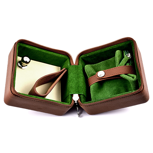 Дорожный кейс Grafton System Pipe,имеет прочный твердый внешний вид из усиленной коричневой кожи, дополненный внутренней подкладкой из зеленой замши и соответствующей коричневой кожаной застежкой.