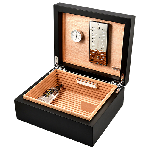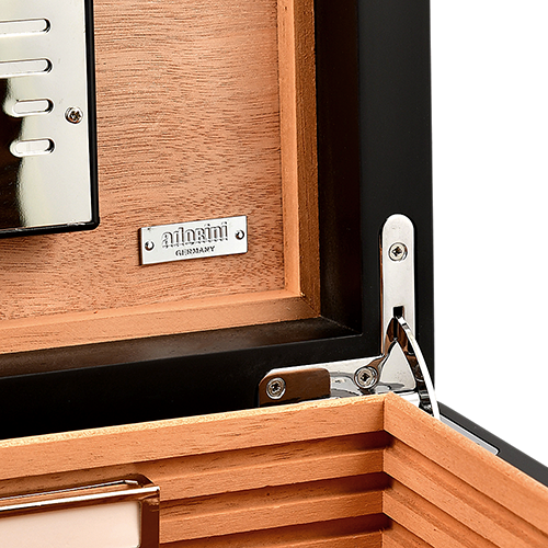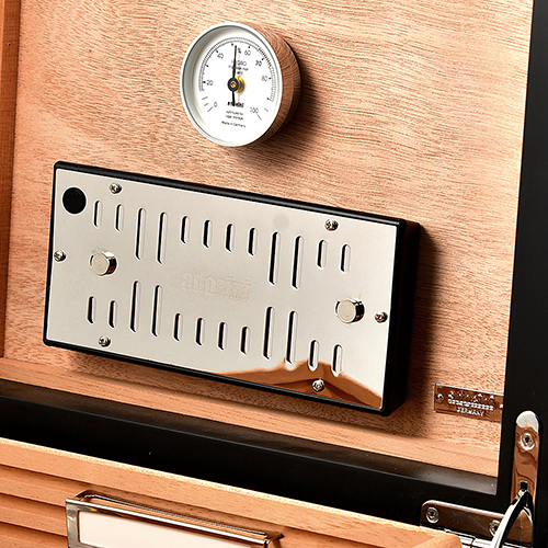 Хьюмидор имеет особо прочный корпус и внутреннюю отделку из кедрового дерева для обеспечения оптимальных условий хранения. Для регулирования влажности хьюмидор оснащен увлажнителем из акрилового полимерного флиса, который поддерживает постоянный уровень влажности внутри. Точный, предварительно откалиброванный волосяной гигрометр немецкого производства позволяет точно контролировать влажность. Оба компонента могут быть прикреплены к крышке хьюмидора магнитами для удобного и компактного хранения.