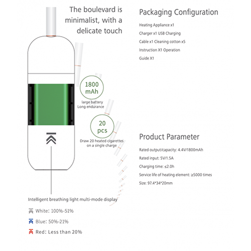 Устройство обладает большой площадью нагрева, засчет новой технологии металлического нагревательного элемента в форме иглы, а так же быстрой скоростью нагрева табачных стиков.