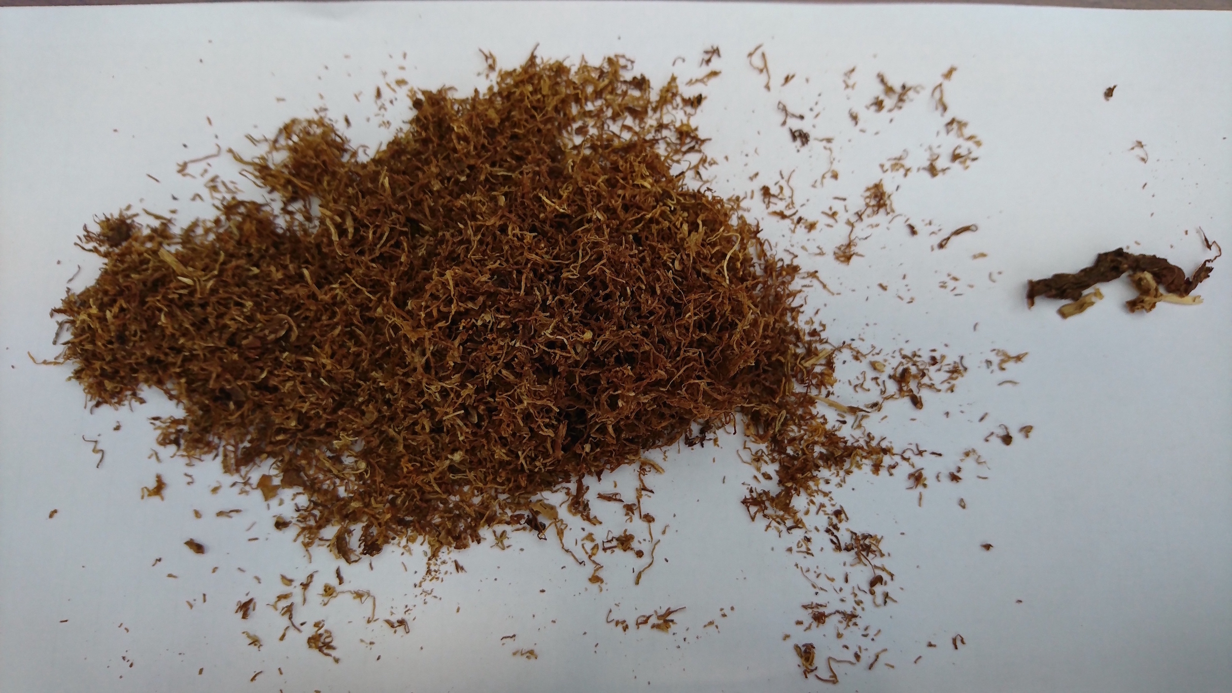 Решил поменять табачок, а то вкус приелся уже. К pepe давно присматривался, даже как-то сигареты курил этой марки, ну и отзывы почитал. В общем купил один кисетик, вскрыл - суховат но в меру, слегка все таки увлажнил, потому как попытки забить прямо из кисета не удались, в пыль крошится, машинка забивается. После увлажнения высыпал не много на лист чтобы удобнее было забить 5-6 гильз за раз, мусор обнаружился и весьма приличный (фото ниже) плюс кусочки листа не измельченного, и даже одна странно-черная фиговина (может быть кунтукки или латакия ггггы) вкус тоже так себе ни какого выражения, в общем разочаровался.