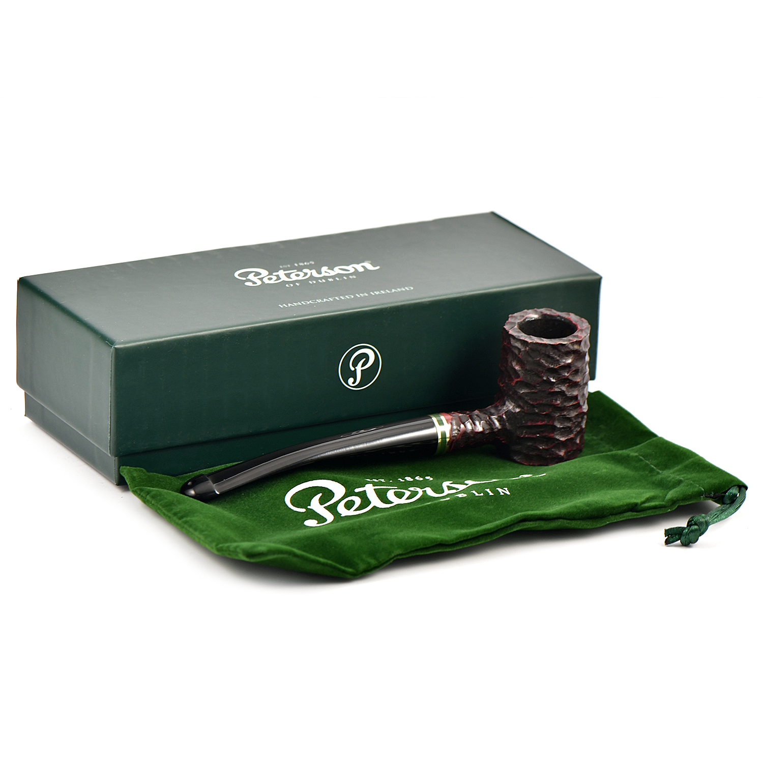 Линия Emerald Rusticated, характеризующаяся глубоким и скалистым рустом с потрясающими акцентами теплой латуни и зеленого акрила, демонстрирует фирменный стиль Peterson с классической презентацией, напоминающей зеленый пейзаж Ирландии. Доступная во множестве самых популярных классических форм, эта линия подчеркивает знаменитую рустированную торговую марку Peterson и традиционные мундштуки P-Lip, запатентованную конструкцию, которая, как доказано, уменьшает прикусывание языка.