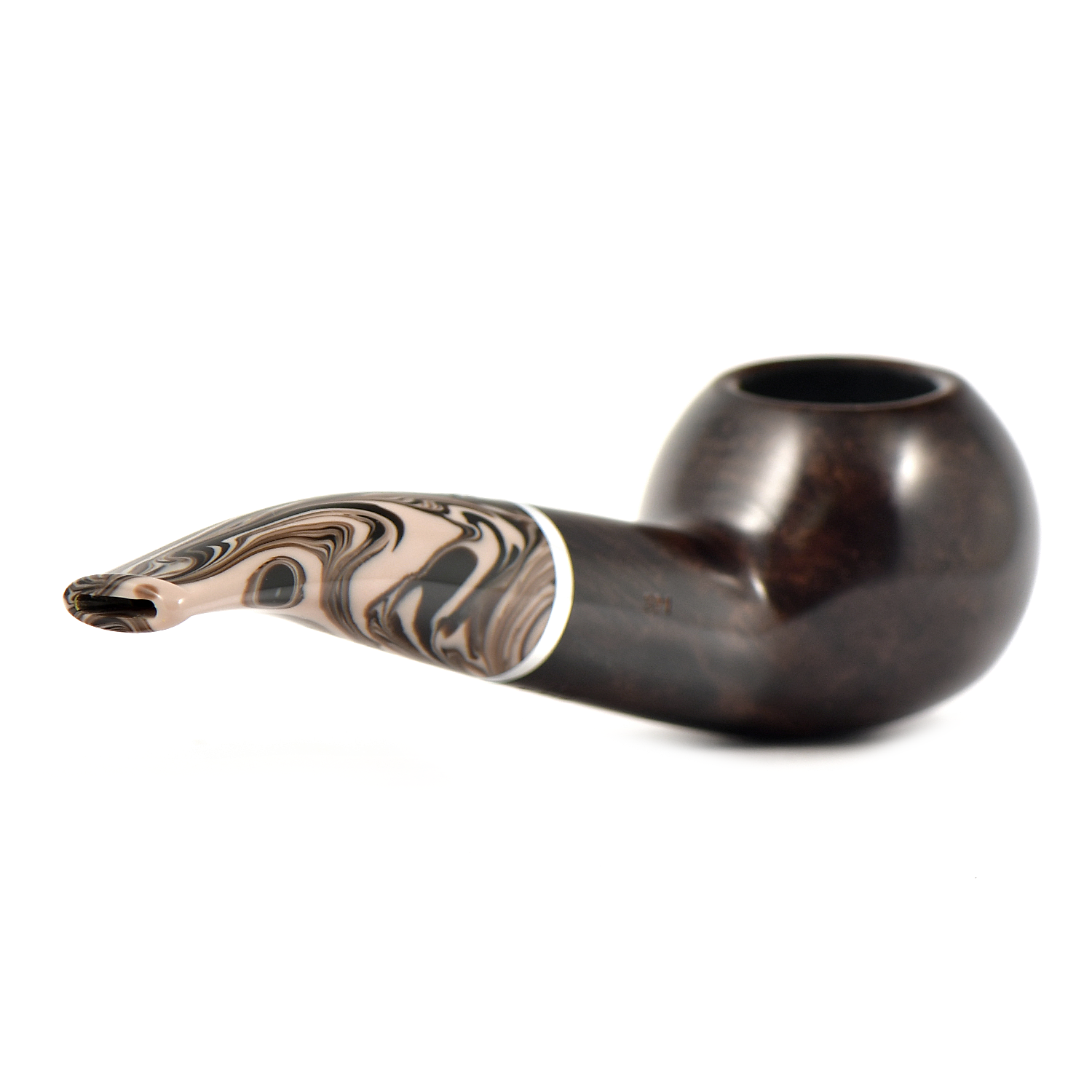 Эта трубка имеет темно-коричневую чашу с гладкой отделкой и черную чашу с рустованной отделкой, а также акриловый мундштук красивого коричневого меланжевого цвета.
