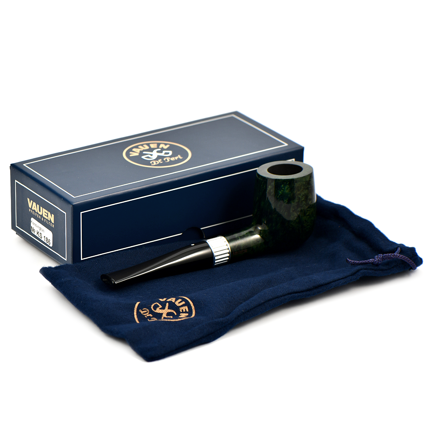 Благодаря своему цвету и широкому рифленому кольцу трубки серии Kensington излучают изящество, создавая классическую и историческую ауру. Рифленая поверхность кольца, одновременно напоминает лепнину старинных фасадов и первые угольные фильтры для трубок. Многоэтапный процесс шлифовки и окрашивания придает чаше высококонтрастный двухцветный вид черного и зеленого тонов.