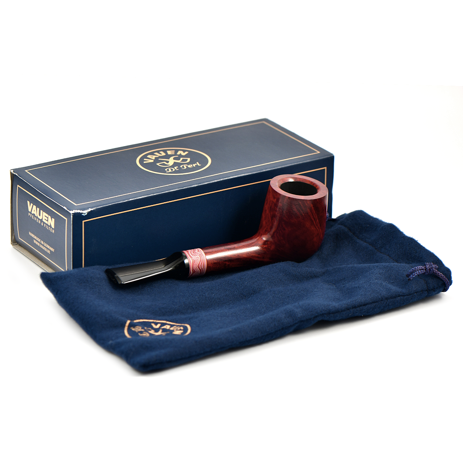 Еще одной специальной серией новинок Vauen, осени/зимы 2023 является серия с говорящим названием «Ros?», которая привлекает внимание розовым кольцом из анодированного алюминия, которому с помощью лазерной гравировки придается впечатляющая структура дамасской стали. Красноватый цвет отделки прекрасно подчеркивает естественную текстуру древесины бриара. В целом эта не самая обычная композиция производит свежее впечатление с неким загадочным антикварно-раритетным оттенком.