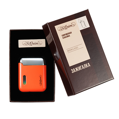 Необычная газовая зажигалка S.Quire с корпусом ярко-оранжевого цвета. Двойное турбо пламя.