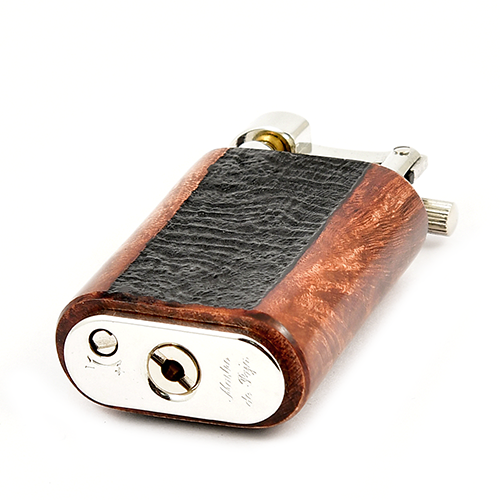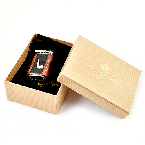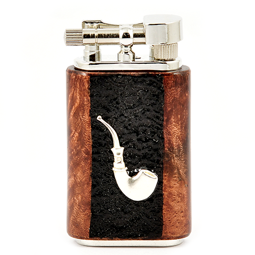 Внешний корпус зажигалки сделан из Бриара и инкрустирован серебряным украшением в виде трубки.